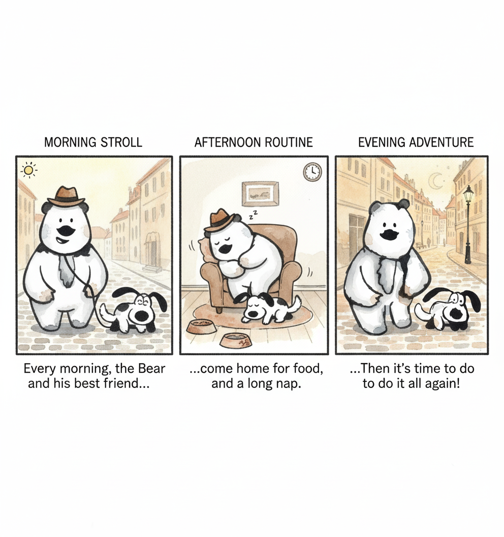 The bear got a new job, the job of a dog walker. The bear loved its new job very much. Every morning, he would set out with the dog. After walking around for a while, he would return home. There, the bear and the dog would have a hearty meal, followed by a good nap.