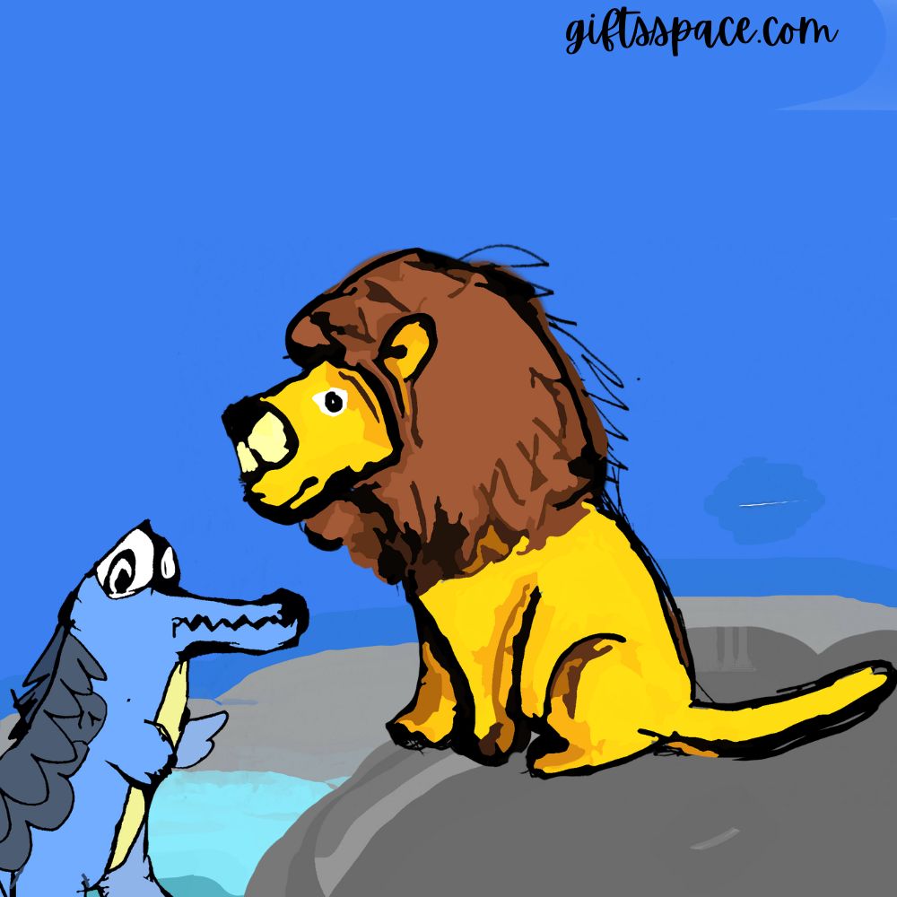 Every time king lion feels low, he comes to the riverside to seek advice from the crocodile guru.